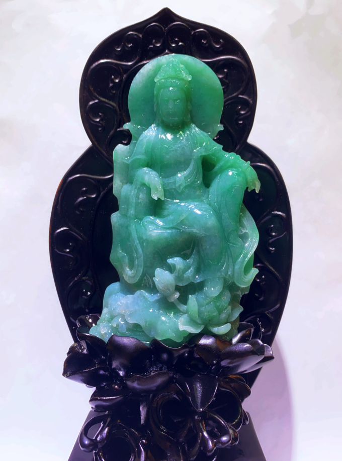 “Royal Green” Jadeite Statue of Guanyin in Royal Ease Pose